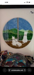 Framed Hand-Painted Round Ceramic Tile featuring White Dogs
