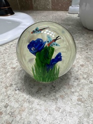 Art Glass Paperweight with Blue Flowers and Dragonflies