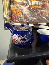 Japanese Navy Blue Floral Teacup and Saucer Set with Sugar and Creamer