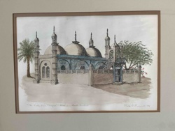 Framed Original Mixed Media Drawing of 'The Little Blue Mosque', Al Khobar, Saudi Arabia by Ruth V. Burnell