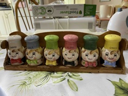 Vintage Anthropomorphic Chef Spice Shaker Set with Wooden Rack