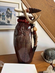 Mixed-Media Wildlife Pottery Vessel with Antler and Stone Accents