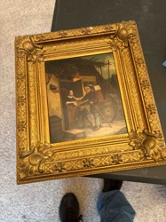 Antique Oil Genre Painting in Gilded Shell and Scroll Frame