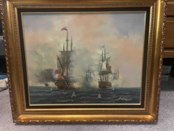 Framed Oil Marine Painting of a Naval Battle