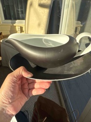 Mid-Century Modern Matte Black and White Porcelain Gravy Boat with Attached Underplate