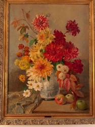 Late Victorian Still Life Oil Painting of Dahlias and Fruit