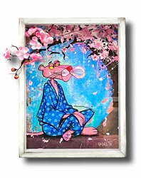 Original Mixed Media Artwork 'Pink Panther in Blue Kimono' by Rakel Waunberg
