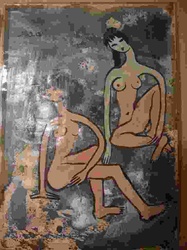 Mid-Century Modern Figurative Mixed Media Painting of Two Nudes