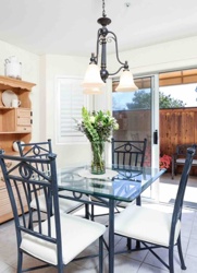 Modern Industrial Glass Top Dining Table and Four Wrought Iron Chairs