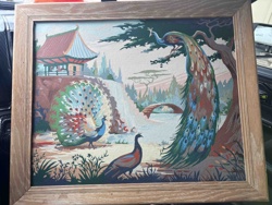 Mid-Century Vintage Paint-By-Number Asian Garden Scene with Peacocks