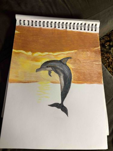 Colored Pencil Drawing of a Jumping Dolphin in a Sketchbook