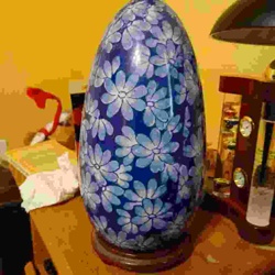 Large Blue and White Floral Porcelian Egg on Wooden Base