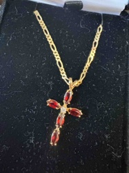 14k Yellow Gold Garnet and Diamond Cross Pendant on Figaro Chain