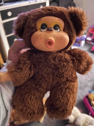 Vintage Monchhichi-Style Brown Bear Plush with Vinyl Face