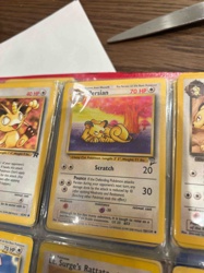 A collection of Pokémon trading cards stored in a binder, featuring various Pokémon from different sets. The cards appear to be in fair to good condition, with visible signs of use. The collection includes a mix of common, uncommon, and potentially rare cards.