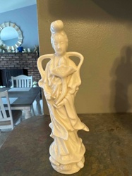Dehua Style Blanc de Chine Porcelain Figurine of a Lady Atop a Guardian Lion (Foo Dog)