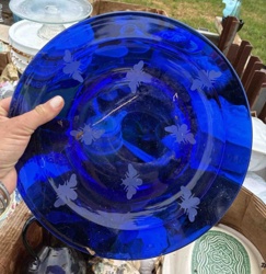 Cobalt Blue Glass Charger Plate with Etched Bee Decorative Motif