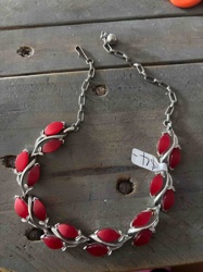 Mid-Century Modern Silver-Tone Choker Necklace with Ruby Red Thermoplastic Cabochons