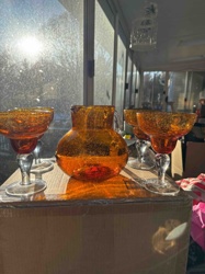 Vintage Amber Crackle Glass Pitcher and Margarita Stemware Set