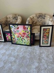 Set of Four Contemporary Floral Framed Art Pieces and Pair of Barrel Chairs