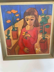 Mid-Century Modern Figurative Oil Painting of a Young Woman with Flowers