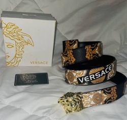 Versace Baroque Print Leather Belt with 3D Medusa Head Buckle