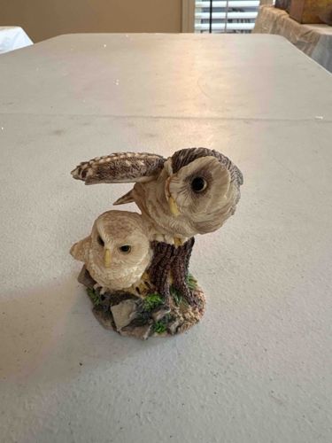 Vintage Resin Owl and Owlet on Tree Stump Figurine