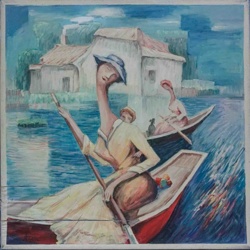 Expressionist Canal Scene with Elongated Figures
