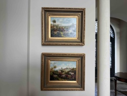 Pair of Framed Tropical Village Oil Paintings