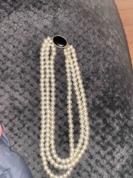 Three-Strand Graduated Faux Pearl Necklace with Black Onyx-Style Clasp