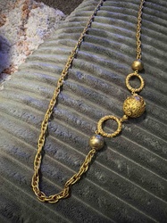 Vintage Brass Geometric Panel and Filigree Bead Sautoir Necklace