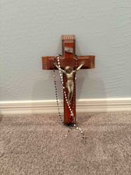 Mid-Century Carved Wood Wall Crucifix with Hanging Rosaries