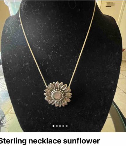 This is a detailed sterling silver necklace featuring a prominent sunflower pendant. The pendant showcases a central floret disk with a textured, beaded granulation finish, surrounded by a symmetrical arrangement of twenty pointed petals. The craftsmanship exhibits high-relief detailing and intentional oxidation (patina) in the recessed areas to enhance the depth and sculptural quality of the floral design. The pendant is suspended on a fine metallic curb or box-style chain with a bright polish. Constructed from what appears to be .925 sterling silver, the piece possesses a classic botanical aesthetic typical of contemporary artisan jewelry. In terms of condition, the necklace shows light signs of surface wear and tarnish, which is consistent with age and gentle use; however, there are no visible deformations, missing petals, or structural failures. While specific maker's marks are not visible on the front, the uniform finish suggests professional manufacturing. This piece represents a timeless floral motif, likely dating from the late 20th to early 21st century, valued for its symbolic 'sunny' disposition and solid silver construction.