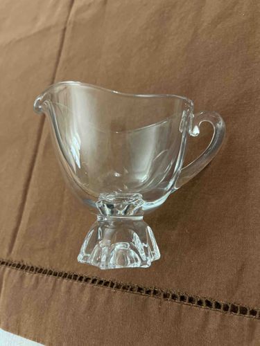 This item is a small creamer pitcher crafted from colorless, transparent pressed glass, specifically identified as the 'American' pattern produced by Fostoria Glass Company. The piece features a high-clarity lead or lime glass composition with a smooth, polished interior and a distinctively geometric exterior. The body is characterized by a tulip-shaped bowl that flares slightly toward a scalloped, wavy rim with an integrated pouring spout. The base is an ornate, multi-faceted pedestal foot with a starburst or sunburst molding on the underside. A single, C-shaped applied handle is positioned opposite the spout, featuring a small thumb rest at the top for ergonomic use. The geometric, blocky aesthetic is characteristic of early 20th-century American pressed glass, with this specific pattern introduced around 1915. The condition appears excellent with high transparency, no visible chips, cracks, or significant clouding, though minor surface scratches consistent with use may be present under closer inspection. The craftsmanship is high-quality for production glass, showing sharp mold lines and a brilliant refractive quality that mimics cut crystal.