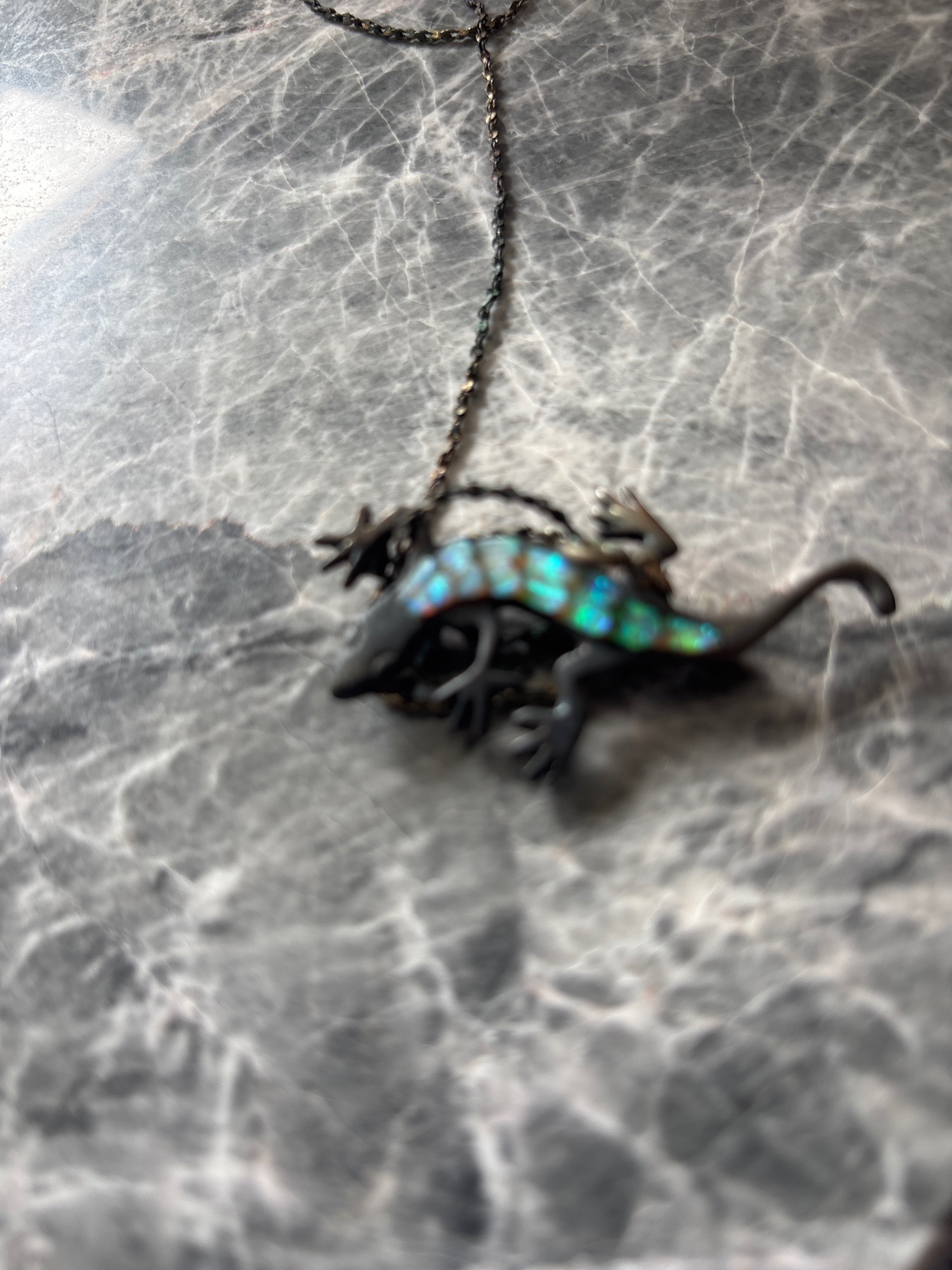 This item is an articulated pendant in the shape of a lizard or newt, suspended from a fine metal chain. The pendant is constructed from a dark-toned metal, likely blackened silver or an oxidized base metal, featuring a series of vibrant inlays along the spine. These inlays appear to be Paua shell or abalone, showcasing iridescent hues of turquoise, emerald green, and deep blue. The creature is depicted in a dynamic, curved posture with detailed limbs and a tapering tail. Based on its design and material composition, the piece likely dates from the late 20th century, possibly the 1970s or 1980s, reflecting the popularity of organic motifs and abalone inlay during that era. The chain is a delicate link style with a significant dark patina or tarnish consistent with age and exposure. While no specific maker's marks are visible in the photograph, the craftsmanship suggests a mid-tier artisan or mass-produced vintage jewelry origins. Condition-wise, the piece shows surface wear and significant oxidation on the metal components, though the shell inlays remain vivid and appear intact. The articulation points allow for slight movement, a hallmark of more intricate novelty jewelry of the period.