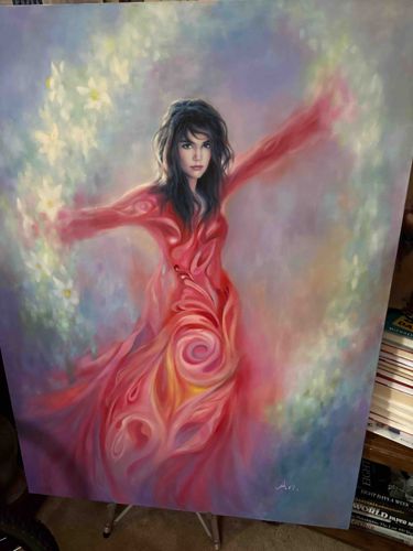 This is a large-scale contemporary oil painting on canvas featuring a central female figure in a dynamic, ethereal pose. The figure is depicted with dark, voluminous hair and high-detail facial features, wearing an abstract red gown that appears to be composed of fluid, swirling brushstrokes resembling flames or flowing liquid. Her arms reach outward into a misty, atmospheric background of soft purples, blues, and whites. To the left, white lily-like floral elements appear to emanate from her hand or float in a celestial arc. The composition uses a vibrant palette of reds, magentas, and yellows for the figure, contrasted against cool pastel tones in the background. The brushwork shows a high level of technical skill, particularly in the soft blending and the rhythmic, organic shapes within the dress. An artist's signature is visible in the lower right corner, appearing to read 'ART' or a stylized 'Ali' with a date suffix. The piece is unframed and appears to be in excellent condition with no visible cracking, fading, or damage to the canvas edges. The style suggests a late 20th to early 21st-century origin, combining elements of realistic portraiture with visionary or fantasy surrealism. The quality of the pigment saturation and the smooth transitions in the skin tones indicate a professionally executed work by a skilled contemporary artist.