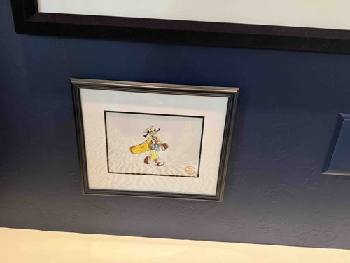 This item is a commercially produced Disney sericel featuring the character Goofy in a golfing theme. Goofy is depicted mid-stride carrying a large yellow golf bag, wearing a light blue polo shirt, yellow trousers, and a white sun visor. The piece is professionally presented in a multi-layered framing system which includes a dark gray ribbed metal or wood frame, a wide white outer mat, and a thin black inner mat border. A distinguishing gold-tone embossed seal from ‘The Walt Disney Company’ is visible in the lower right corner of the image area, which is a standard authentication marking for licensed animation art reproductions. The background features a subtle, wavy pattern that suggests a sand trap or golf course terrain. The artwork appears to be a limited edition serigraph cel, a technique used to recreate animation frames for the collector market. The condition of the piece appears excellent, with no visible signs of foxing, sunlight fading, or moisture damage to the mats or the cel itself. The frame shows no significant scuffs or corner separation. Based on the style and marking, this piece likely dates from the late 1980s to the 1990s when Disney sericels were highly popular collectibles.