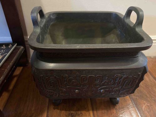 This is a rectangular bronze incense burner, known as a censer, modeled after the ancient ritual 'fangding' vessels of the Shang and Zhou dynasties. It is constructed from a heavy cast copper alloy, likely bronze with a high lead or tin content, and features a dark brown-black aged patina. The vessel has a square-lipped mouth with two upright u-shaped handles (ears) and is supported by four short cabriole-style feet. The body is decorated with low-relief archaic motifs, specifically a stylized taotie (monster mask) pattern on each face, characterized by symmetrical swirling leiwen (thunder patterns). A narrow band of scrolling thunder patterns also encircles the neck of the vessel. Physically, the item shows signs of significant age and use, including a thick layer of dust and surface oxidation, as well as remnants of white ash or incense residue in the interior cavity. There are minor abrasions and surface scuffs consistent with handling and a possible small dent on the upper lip, but no structural cracks or major repairs are immediately visible. The craftsmanship suggests a 19th or early 20th-century manufacture (Qing dynasty or Republic period), emulating the bronze-working traditions of earlier centuries with solid casting and hand-finished decorative detailing.