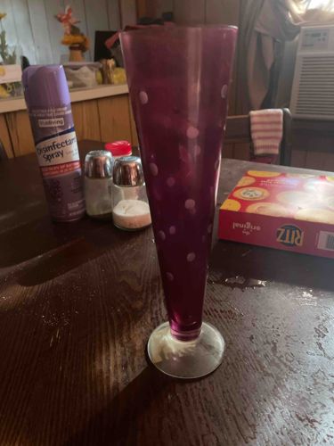 This item is a decorative trumpet-style glass vase featuring a deep amethyst or cranberry purple hue. The vase stands approximately 10 to 12 inches tall and is constructed from blown glass with a tapered, conical body that flares slightly at the rim. Its defining aesthetic characteristic is a pattern of opaque white, hand-applied polka dots or 'coin spots' scattered across the exterior. The piece transitions into a clear, circular pedastal base which provides stability to the slender form. The glass demonstrates a rich translucency, typical of mid-century or late 20th-century art glass. Close inspection suggests it may be hand-finished, evidenced by the slight irregularities in the dot placement and the fluid transition from the colored body to the clear base. The overall condition appears fair to good, with some visible water spotting or mineral residue on the exterior surface that may require cleaning. There are no immediate signs of chips or cracks in the photograph, though the frosted appearance near the base suggests potential calcification from use. The style is reminiscent of Victorian cranberry glass revivals or 1950s-1970s studio glass. The craftsmanship shows a balanced proportion and a vibrant use of color, making it a functional yet highly decorative piece of glassware.