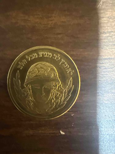 This is a circular commemorative medal or token, presumably minted in Israel, featuring a gold-toned metallic finish (likely brass or gold-plated bronze). The obverse side displays a central high-relief bust of a soldier wearing a modern combat helmet with a textured camouflage cover. This central figure is flanked by olive branch sprigs, symbolizing a desire for peace amidst military service. Inscribed along the upper arc is a Hebrew phrase which translates to 'From his courage, a heart reaches out to all hearts,' or 'Thanks reaching from the heart' depending on the specific translation of the poetic script. The medal appears to be in good condition, showing a reflective, mirror-like surface in the fields, indicating it may be 'proof-like' in its strike quality. There are minor surface abrasions and light fingerprint smudges consistent with handling, but no significant tarnish, corrosion, or edge dings are visible. The craftsmanship demonstrates clear, sharp die work common in state-issued commemorative pieces from the late 20th century. The lighting highlights a consistent yellow-gold hue across the diameter. These items are typically produced by the Israel Government Coins and Medals Corporation (IGCMC) to honor military service or significant national milestones.