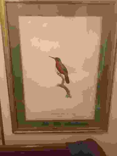 This item is a framed 18th-century hand-colored copperplate engraving depicting a single bird, likely a kingfisher or similar species, perched on a branch. The artwork is characterized by an elegant, scientific illustration style typical of Natural History studies from the 1700s. The bird is rendered with detailed plumage in shades of reddish-brown and deep green, with a prominent long beak. The paper appears to be an aged off-white or cream-toned laid paper, common for the period. Notable features include handwritten or typed scientific nomenclature visible at the bottom of the print, which identifies the species and possibly the original publication plate number. The engraving is housed in a decorative gilded wood frame with a green decorative mat board. Regarding condition, there is visible tanning/toning to the paper consistent with its age, likely due to light exposure and archival materials of the past. The frame shows some minor surface wear and patina. The craftsmanship is high, reflecting the specialized skill of 18th-century etchers and colorists who manually applied watercolors over the printed black ink plates. This piece represents the intersection of scientific discovery and fine art from the Enlightenment era.