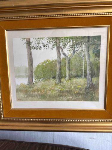This is an original landscape watercolor painting attributed to the Swedish artist Robert Högfeldt (1894–1986). The artwork depicts a serene lakeside or riverside scene featuring a cluster of tall, slender deciduous trees in the foreground, likely birches or poplars based on the bark textures. The color palette is dominated by soft greens, muted greys, and earthy browns, executed with a delicate wash technique characteristic of mid-20th-century European landscape art. The foreground shows a grassy bank with hints of yellow wildflowers, transitioning into a dense thicket of green foliage and a calm body of water to the left. A visible signature is located in the lower left corner, reading 'Högfeldt'. The painting is housed in an ornate, period-appropriate frame featuring a wide ochre/gold velvet-lined inner matting and a molded gilt-wood outer border with beaded detailing. The frame shows some minor age-related wear and dust accumulation, but the artwork itself appears to be in stable condition with no significant foxing or fading visible through the glass. The style reflects a more traditional, observational approach compared to Högfeldt's more famous humorous or satirical illustrations, demonstrating his skill in classical naturalist representation.