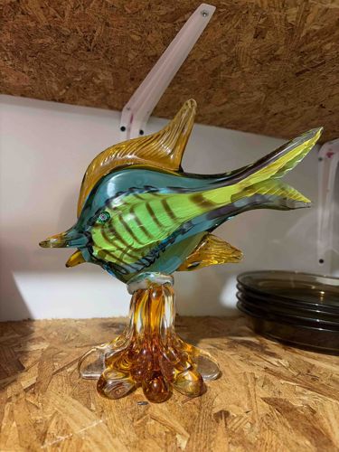 This decorative glass statue depicts a stylized angelfish mounted atop a sculpted glass base designed to resemble coral. The piece features a vibrant multi-colored palette, utilizing a 'sommerso' or similar layering technique where lime green, teal blue, and amber hues are encased within clear glass. The body of the fish displays dark vertical striations or 'ribs' that mimic natural fish markings, while the fins are rendered in a warm amber tone with textured, ribbed detailing to simulate realistic anatomy. The fish is posed in an upward-swimming motion, supported by a clear and honey-amber base that flares out into textured nodules. In terms of construction, it appears to be hand-blown or lamp-worked with solid glass elements. The craftsmanship suggests a mid-to-late 20th-century origin, reminiscent of Murano-style Italian glass or high-quality decorative imports from that era. While no specific maker's marks or signatures are visible in the image, the clarity of the glass and the smoothness of the joins indicate professional artisanal production. There is no visible damage, such as chips or notable scratches, and the item appears to be in excellent vintage condition with its original glossy luster intact.