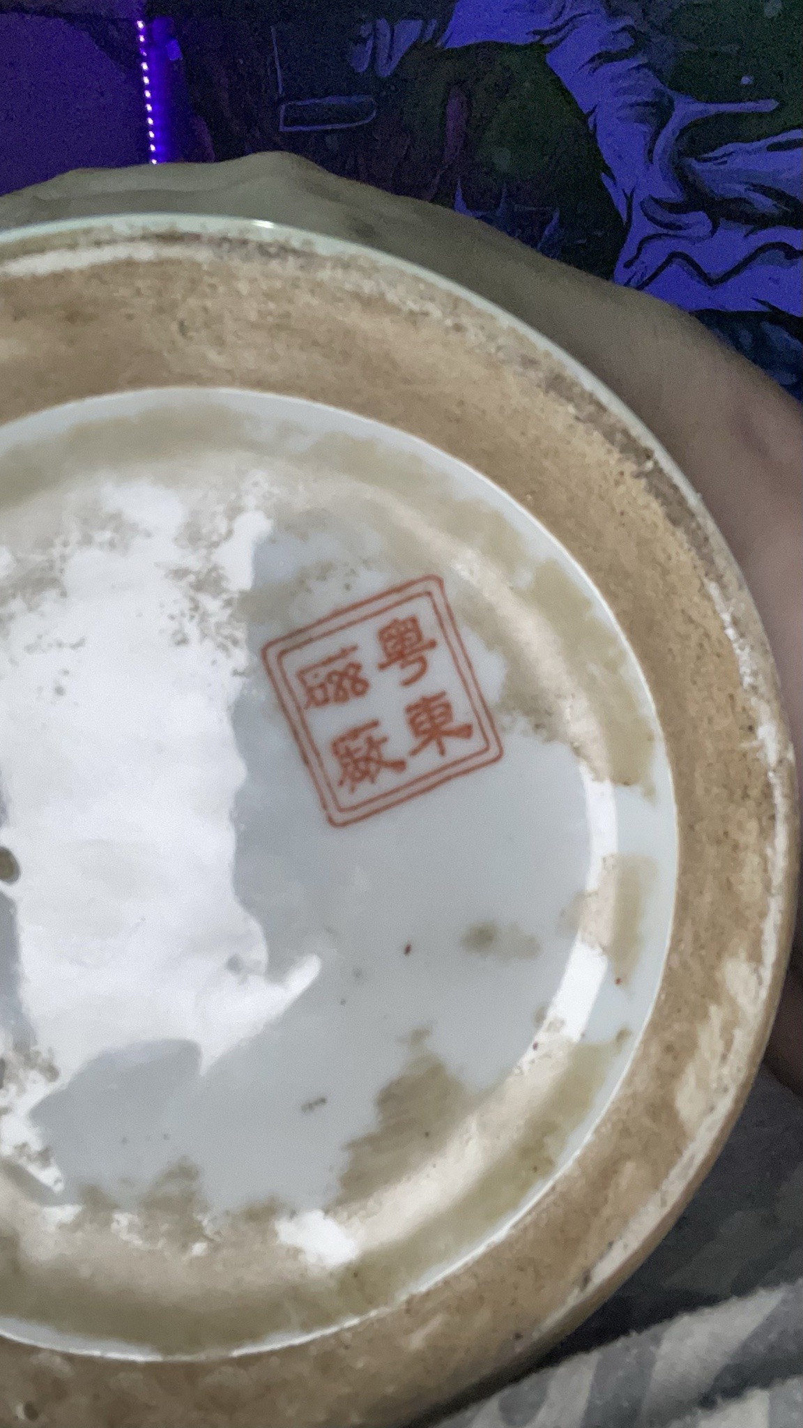 This item is the base of a Chinese ceramic vessel, most likely a vase or a ginger jar, featuring a distinct overglaze iron-red four-character mark. The mark reads 'Guangdong Ci Chang' (廣東磁廠), which translates directly to 'Guangdong Porcelain Factory.' This specific factory mark is typically associated with mid-to-late 20th-century production, particularly items exported from the Guangdong province during the 1950s through the 1970s. Physically, the piece is made of a white porcelain body with a clear glaze finish. The central recessed foot is glazed, highlighting the red stamp, while the foot rim is unglazed (biscuit porcelain) and shows significant brownish-yellow staining and surface grime, suggesting several decades of age or storage wear. Notable features include the square, double-bordered red seal mark which is characteristic of the export wares of that era. There are several visible condition issues, including irregular glaze thinning near the foot, scattered surface pitting (pinholes), and significant localized discoloration/organic staining around the unglazed rim and interior glaze surface. The craftsmanship represents a industrial-scale artisanal production, where hand-finishing is combined with standardized factory marking. The style is indicative of the 'Canton' style export porcelain revival seen in the late Republic to early People's Republic of China periods.