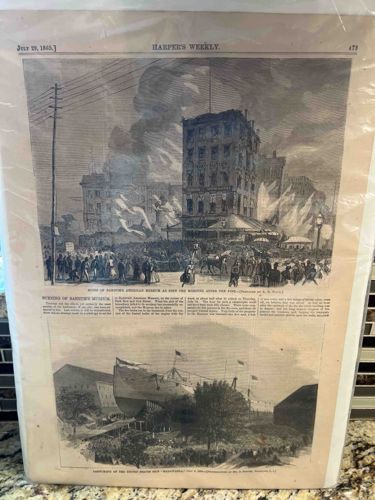 This is an original page from the July 29, 1865 issue of Harper's Weekly, a highly influential American political magazine of the 19th century. The page features a large wood-engraved illustration titled 'RUINS OF BARNUM'S AMERICAN MUSEUM AS SEEN THE MORNING AFTER THE FIRE.' This dramatic scene depicts the aftermath of the fire that destroyed P.T. Barnum's famous New York City landmark. Below the main illustration is a detailed news report and a second, smaller engraving titled 'LAUNCHING OF THE UNITED STATES SHIP MADAWASKA.' The page is printed on typical period newsprint (wood pulp or rag paper) with black ink. The upper edge shows the publication date and page number 473. The condition appears fair to good for its age; there is visible yellowing and foxing consistent with old paper, and it is currently protected in a plastic sleeve. The printing shows the fine, cross-hatched detail characteristic of 19th-century wood engraving, a labor-intensive illustrative technique. Notable elements include the depiction of Victorian-era crowds, horse-drawn carriages, and the charred shell of the five-story museum building. This artifact serves as a significant primary source document regarding both the history of American entertainment and naval construction during the tail end of the Civil War era.