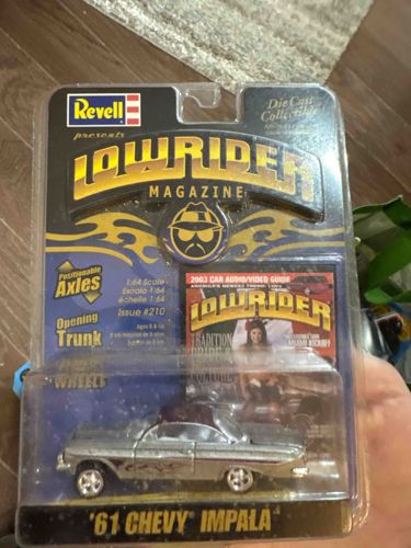 This is a 1:64 scale die-cast model of a 1961 Chevrolet Impala, produced by Revell as part of their 'Lowrider Magazine' licensed collection. The vehicle features a metallic silver primary paint job with what appears to be a dark metallic red or deep maroon roof. Notable design features include specialized 'Positionable Axles' to simulate a lowrider stance and an 'Opening Trunk' feature, which indicates a higher level of craftsmanship and mechanical detail than standard die-cast toys. The car sits on chrome-styled custom wheels and is presented in its original clamshell plastic blister packaging. The backing card features the iconic Lowrider Magazine logo with gold flame accents and a miniature reproduction of Issue #210 (the 2003 Car Audio/Video Guide). This item dates to approximately 2003. Regarding condition, the item is 'New In Box' (NIB), though the outer plastic shell shows minor surface scuffing and slight edge wear on the cardboard backing from long-term storage. The vehicle itself appears pristine inside the factory seal, with no signs of zinc rot or paint degradation. This series is highly collectible due to its niche connection to Chicano car culture and the specific mechanical features of the axle articulation.