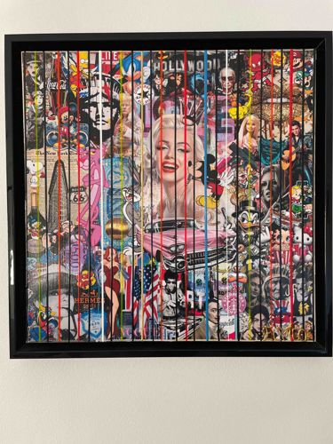This is a vibrant and complex mixed media contemporary artwork attributed to the French artist Elmago. The piece is a square-format collage that utilizes a dense layering technique characteristic of the Neo-Pop and Street Art movements. Visually, the composition is a chaotic but structured montage of iconic cultural imagery, featuring figures such as Marilyn Monroe at the center, Mickey Mouse, Bugs Bunny, Audrey Hepburn, and Salvador Dalí, interspersed with logos like Coca-Cola, Hermes, and Starbucks. The background is composed of various print mediums, likely acrylic and spray paint on canvas or paper. A defining stylistic element is the set of vertical drips or strings in primary and vibrant colors (red, white, blue, yellow) that run from the top to the bottom of the frame, adding a tactile, three-dimensional quality to the surface. The artwork is housed in a sleek, black deep-set float frame which enhances the depth of the interior textures. In the bottom right corner, a distinctive metallic gold-tone relief signature reading 'ELMAGO' serves as the primary maker's mark. The condition appears excellent with no visible fading, tears, or aging to the pigments, suggesting it is a contemporary piece produced within the last decade. The craftsmanship reflects high-quality commercial art standards, with sharp image resolution and professional mounting.
