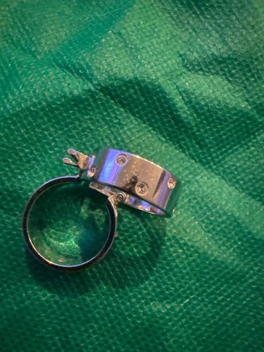 This pair of huggie-style hoop earrings features an industrial-inspired aesthetic, reminiscent of high-end luxury motifs. The earrings are crafted from a polished white metal, likely silver-toned or white gold-plated, with a flat, wide band profile. The exterior of each hoop is set with circular brilliant-cut clear stones, possibly cubic zirconia or small diamonds, recessed into the metal in a flush or bezel-style setting. Notably, the metal surface between the stones includes vertical recessed notches or linear indentations that alternate with the stones, creating a rhythmic pattern around the circumference. The construction utilizes a hinged closure mechanism with a curved post that snaps into a v-shaped notch for a secure fit. The interior surface of the band appears smooth and high-polish. Condition-wise, the pieces show evidence of surface scratches and minor scuffing, particularly on the flat top surfaces, consistent with regular wear. There are no immediate signs of hallmarking visible in the top-down view, though typically such marks are found on the post or inner band. The style is contemporary, likely dating from the early 21st century, prioritizing a minimalist yet bold decorative language.