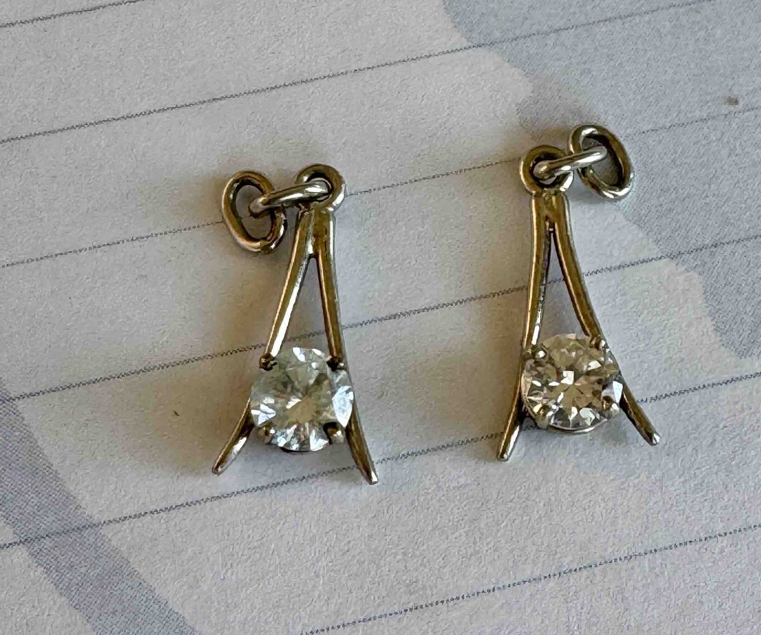 This is a matching pair of drop-style earring components or small jewelry pendants featuring an architectural, modernist geometric design. Each piece is constructed from a cool-toned white metal, likely sterling silver or white gold, featuring an elongated 'A-frame' or wishbone structure. The metal arms converge at a top bail, which is attached to two interlocking jump rings for suspension. Near the base of each frame, a round brilliant-cut colorless stone is securely held in a four-prong setting. The stones exhibit significant dispersion and internal reflection, suggestive of high-grade cubic zirconia or diamonds. The construction appears to be cast rather than hand-forged, characteristic of late 20th-century or contemporary manufacturing. Both pieces show evidence of wear including light surface scratches and a slight yellowing or tarnish consistent with silver or unplated white gold. No visible maker’s marks or purity stamps are discernible in the photograph, but the craftsmanship is industrial and symmetrical. The overall aesthetic belongs to the minimalist contemporary jewelry period, focusing on clean lines and negative space.