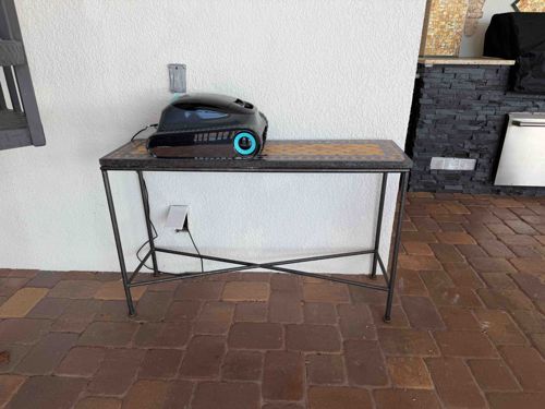 This is a rectangular console or sofa table designed for indoor or protected outdoor use. The piece features a decorative mosaic tile inlay tabletop, characterized by a repeating geometric pattern of ochre, tan, and dark brown tiles arranged in a rectangular perimeter border. The table's structure is composed of a minimalist wrought iron frame with an antiqued dark bronze or black finish. The base includes four slender legs transitioning into a cross-braced (X-stretcher) support system for stability, ending in simple button-style feet. The tabletop is encased in a thick metal apron that secures the masonry work. In terms of condition, the frame shows some light environmental patina consistent with use on a covered patio; however, the tile work appears intact without visible cracking or missing tesserae. The style is reminiscent of Mediterranean or Southwestern rustic furniture from the late 20th to early 21st century. The craftsmanship is of a standard commercial quality, prioritizing durability and weighted stability. Currently, the table is being used as a stand for electronic equipment, including what appears to be a robotic pool cleaner charging station.